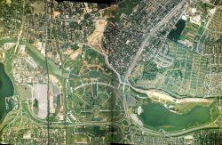 of Unisphere Theme Center; aerial view of Flushing Meadows, Spring
